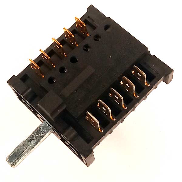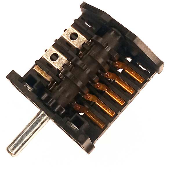 Переключатель режимов духовки 5-ти позиционный (4 рабочих + 0) для плит и духовых шкафов. Номера контактных групп: 1а, 2а, 3а, 4а, 5а, номера контактов на противоположной стороне: 1, 2, 3, 4, 5. Длина штока 23 мм, материал корпуса - пластик, цвет - черный. Рабочее напряжение 250V (Вольт), максимальный ток 16A (Ампер).