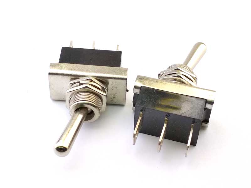 Тумблер 12V 25А (3c) ON-OFF-ON однополюсный предназначен для коммутации электрических цепей напряжением 12В. Такая разновидность переключателей применяется на лицевых панелях в качестве комплектующих изделий различного электрооборудования (в измерительных приборах, блоках питания, электроустановках на различных производствах, легковых и грузовых автомобилях, поездах и многих других местах). Отличительной особенностью тумблера является металлический перекидной переключатель, принцип действия которого основан на его перемещении в одну из позиций. Для переключения в нужное положение требуется приложить некоторые усилия. Монтаж осуществляется без применения винтов на плоских панелях толщиной от 0.8мм до 4мм. Подключение контактов осуществляется с помощью плоских клемм, либо с помощью пайки.
