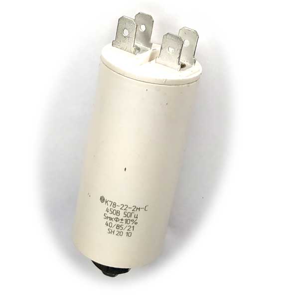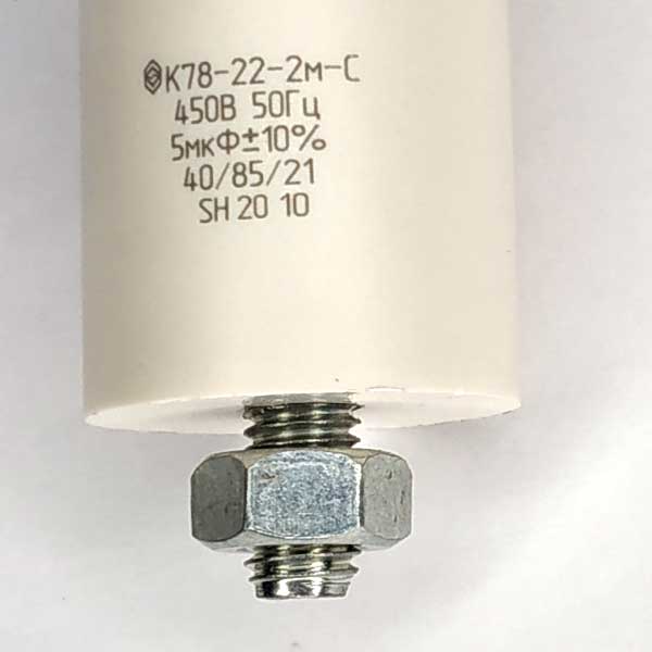Пусковой конденсатор К78-22-2м-С номинальной емкостью 5 мкФ с рабочим напряжением до 450 вольт.