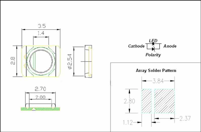 Размер светоизлучающей поверхности:3.5x2 .8x0 .6m m( LxW x H),d=2.0mm