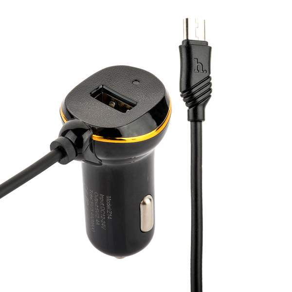 Hoco Z14 автомобильное зарядное устройство с одним портом USB и встроенным кабелем с подключением MicroUSB. Подсоединяется к прикуривателю в автомобиле. Возможно подключение и зарядка двух устройств одновременно с максимальным выходным током в 3.4А. Кабель с подключением MicroUSB является встроенным и неизменным, а вот через порт USB можно подключить любой другой смартфон с любым портом подключения - для этого вам понадобится соответствующий зарядный кабель (отдельно).